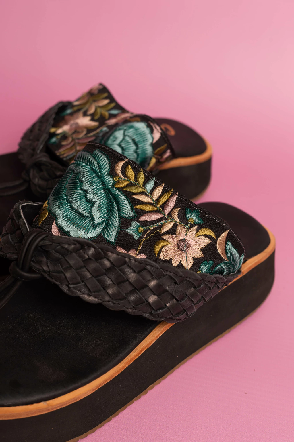 Sandalia de cuero negro y guarda bordada. Material de la base: goma eva y caucho. Altura de la base: 4,5cm.